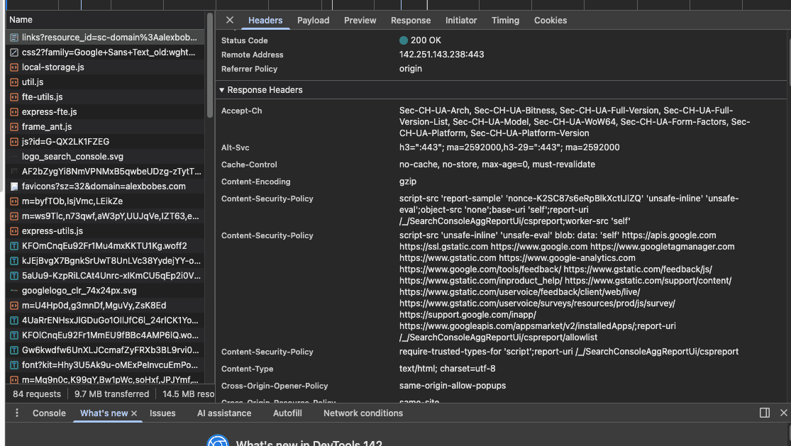 Next, navigate to the network tab within the browser's dev tools and select the first URL that appears as a document type. This should be a request for a URL that follows this format: https://search.google.com/search-console/links?resource_id=sc-domain%3A{YourDomainName}